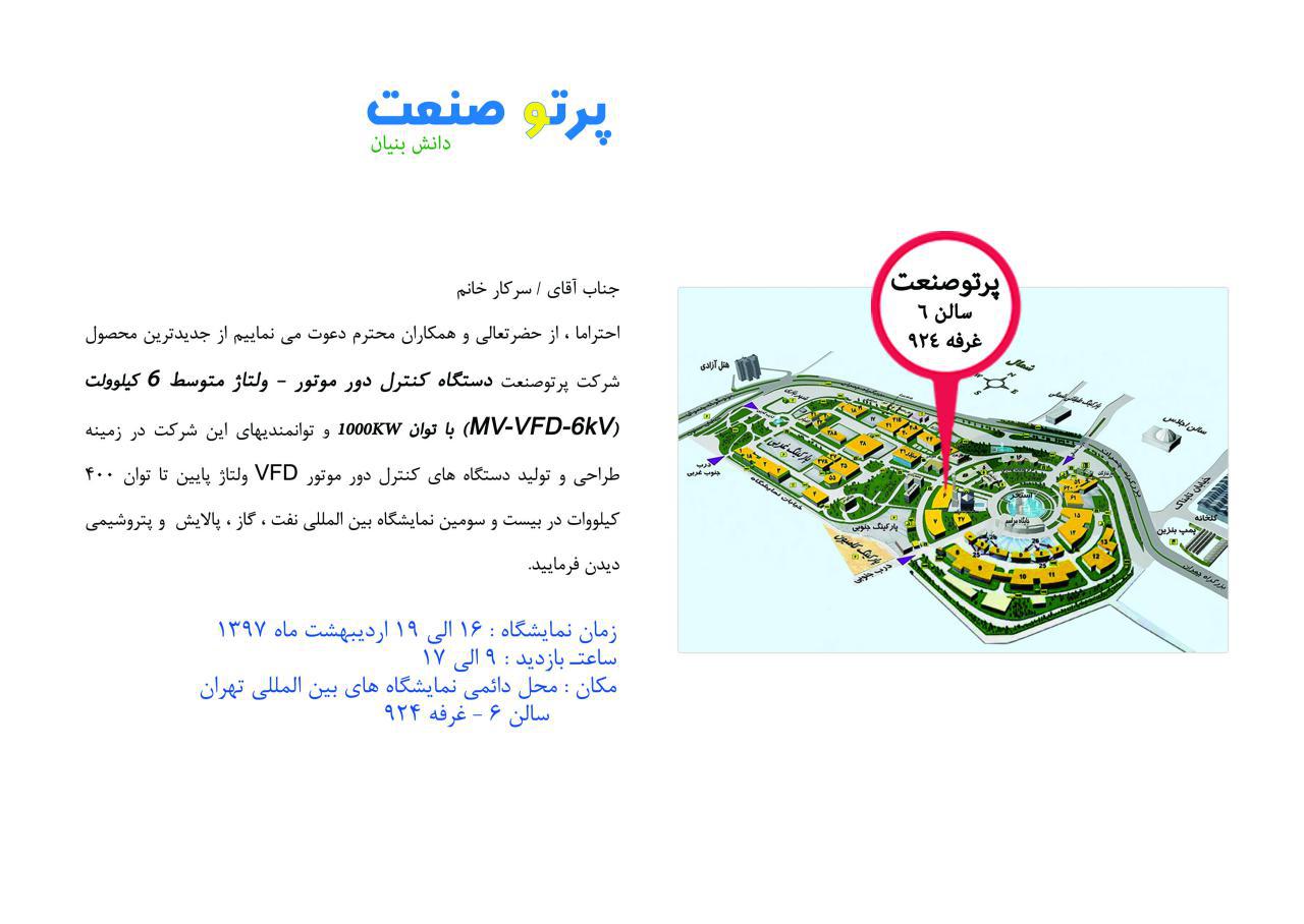 شرکت پرتوصنعت از شما علاقه مندان دعوت می نماید از جدیدترین محصول این شرکت دستگاه کنترل دور موتور – مدیوم ولتاژ 6kV – توان 1000KW و توانمندیهای این شرکت در زمینه طراحی و تولید دستگاه های کنترل دور موتورVFD ولتاژ پایین تا توان 400 کیلووات در بیست و سومین نمایشگاه بین المللی نفت، گاز، پالایش و پتروشیمی دیدن فرمایید.